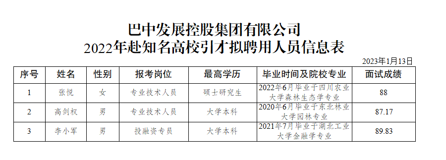 根據(jù)《四川省巴中市2022年赴知名高校引才公告》《巴中市國(guó)有資產(chǎn)監(jiān)督管理委員會(huì)關(guān)于印發(fā)<巴中市市屬國(guó)有企業(yè)機(jī)構(gòu)設(shè)置和勞動(dòng)用工管理辦法(試行)>的通知》(巴市國(guó)資發(fā)〔2020〕67 號(hào))等規(guī)定,經(jīng)網(wǎng)上報(bào)名、資格審查、面試、體檢等程序,現(xiàn)對(duì)符合崗位要求的張悅等3名擬聘用人員即日起進(jìn)行公示(詳見(jiàn)附件)。