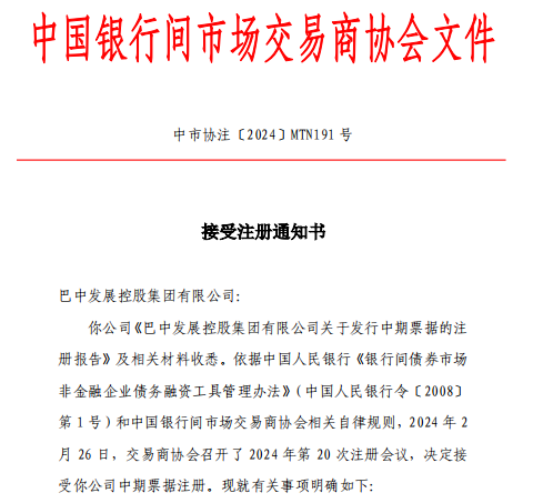 2月28日,巴中發(fā)展控股集團(tuán)成功獲得中國(guó)銀行間市場(chǎng)交易商協(xié)會(huì)出具中期票據(jù)注冊(cè)的批文(中市協(xié)注〔2024〕MTN191號(hào)),注冊(cè)金額20億元,批文有效期2年,這是巴中發(fā)展控股集團(tuán)獲評(píng)AA+主體信用等級(jí)以來(lái)又一重大突破。下一步,巴中發(fā)展集團(tuán)將密切關(guān)注資本市場(chǎng)行情擇機(jī)擇期發(fā)行,爭(zhēng)取獲得低利率發(fā)行成本,實(shí)現(xiàn)債券首發(fā)成功。