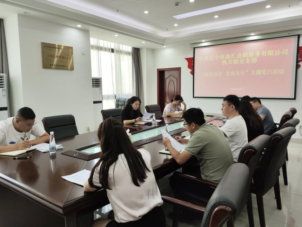 為進(jìn)一步提高廣大黨員干部知詐、識(shí)詐、防詐、反詐意識(shí),8月31日上午,中共巴中市鑫匯金融服務(wù)有限公司機(jī)關(guān)聯(lián)合支部開(kāi)展“防詐反詐 黨員先行”主題黨日活動(dòng),機(jī)關(guān)聯(lián)合支部全體黨員、發(fā)展對(duì)象、入黨積極分子參加。